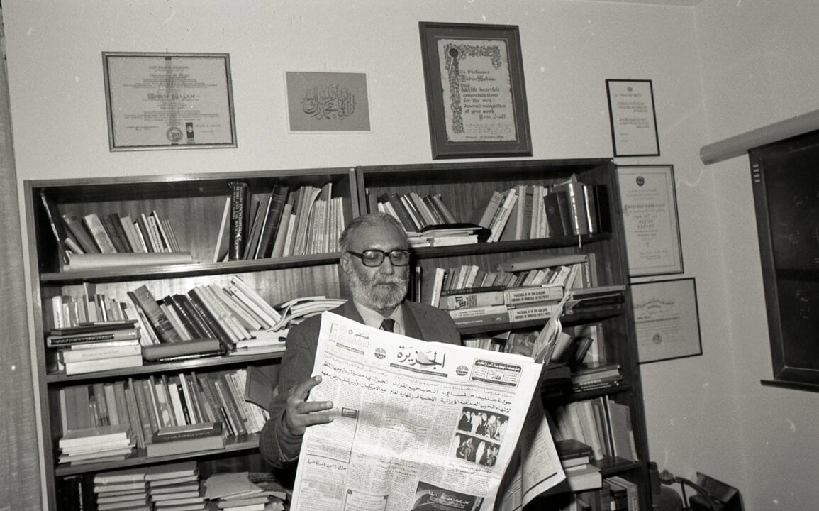 3 (of 3) Abdus Salam reading a newspaper, 1983.