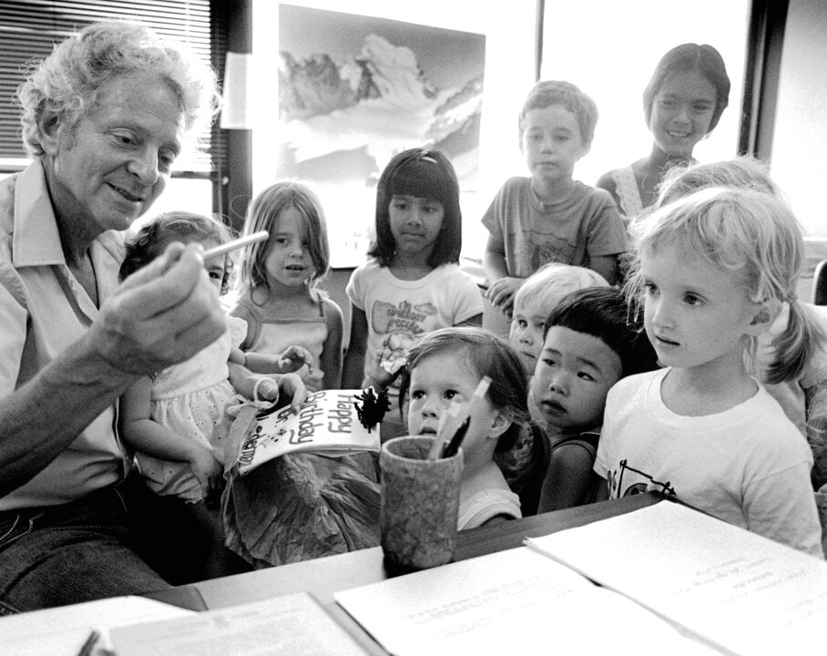 Leon Lederman celebrates his birthday with children from the Fermilab daycare center.