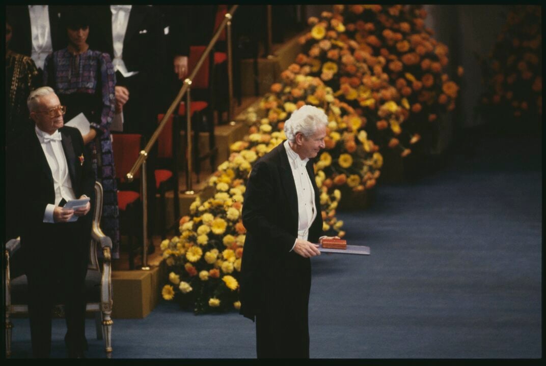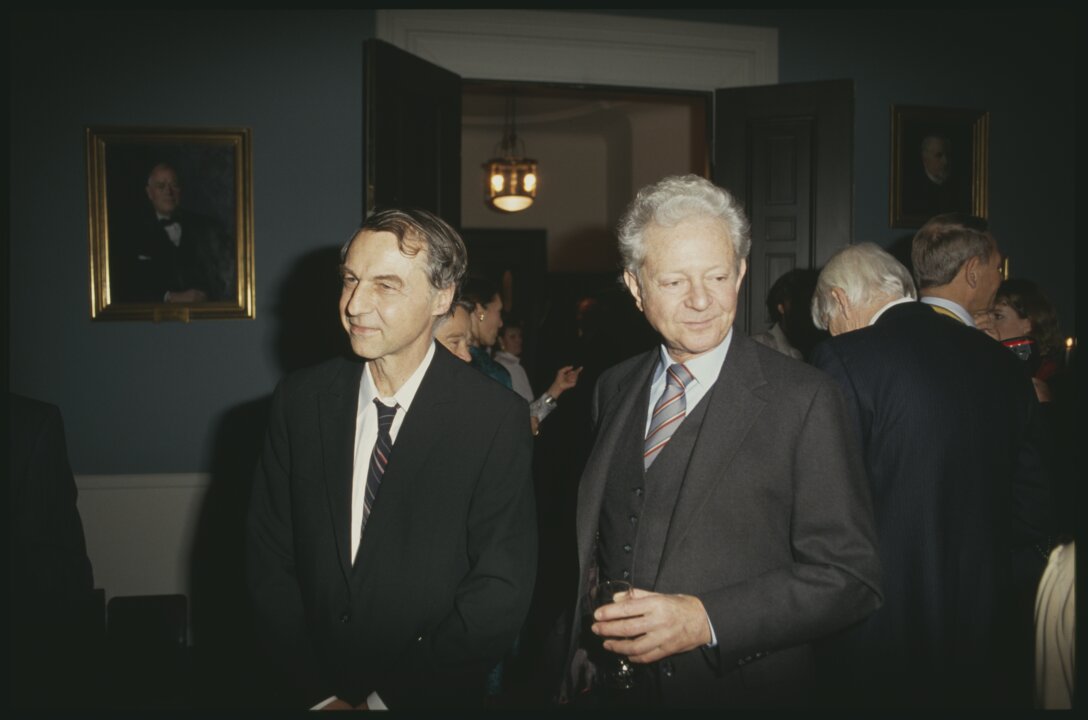 Chemistry laureate Robert Huber and physics laureate Leon Lederman during Nobel Week in Stockholm, December 1988.
