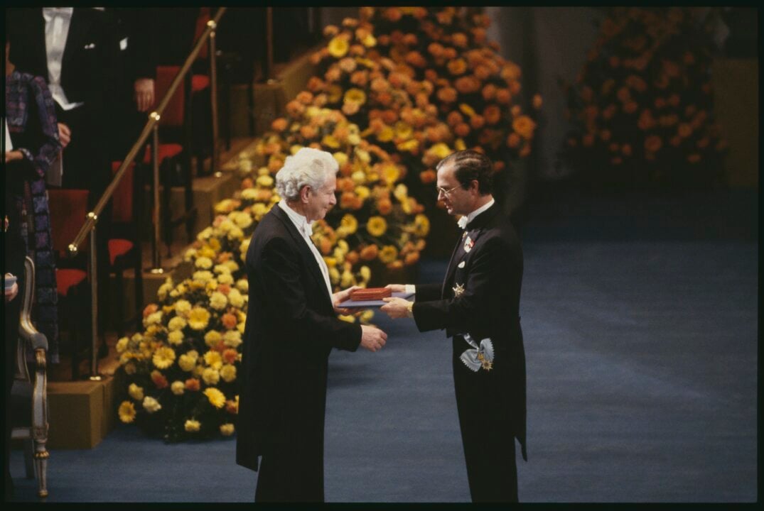 Leon Lederman receiving his Nobel Prize from H.M. King Carl XVI Gustaf of Sweden at Konserthuset Stockholm on 10 December 1988.