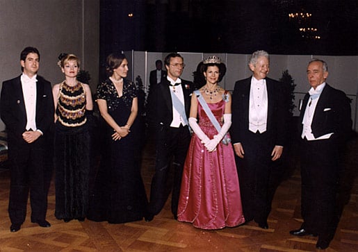 Their Majesties King Carl XVI Gustaf (center) and Queen Silvia of Sweden (third from right) pose with Leon Lederman (second from right) and his family. They are joined by Lars Gyllensten (right), Chairman of the Nobel Foundation and member of the Swedish Academy. Photo taken at the Nobel Banquet in the Stockholm City Hall, Sweden, on 10 December 1988.