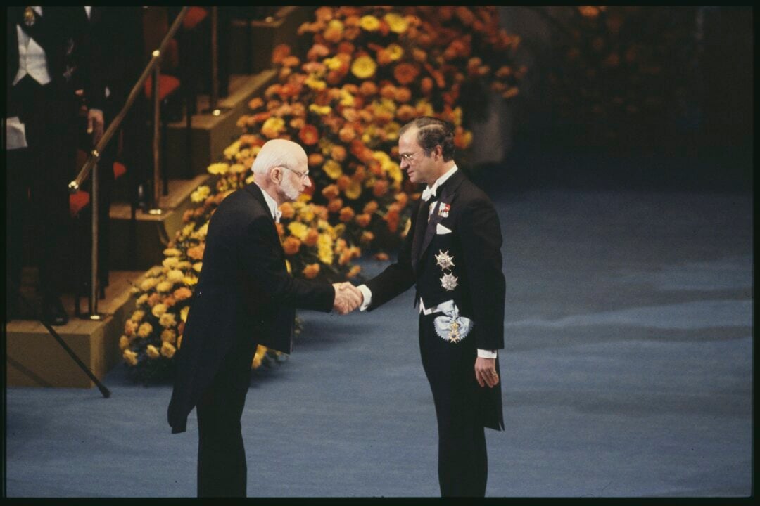 1 (of 6) Hans G. Dehmelt receiving his Nobel Prize from H.M. King Carl XVI Gustaf of Sweden at the Stockholm Concert Hall on 10 December 1989.