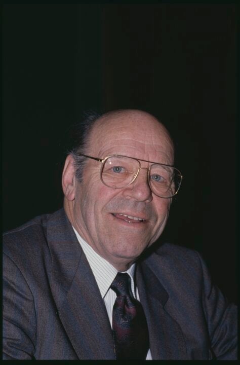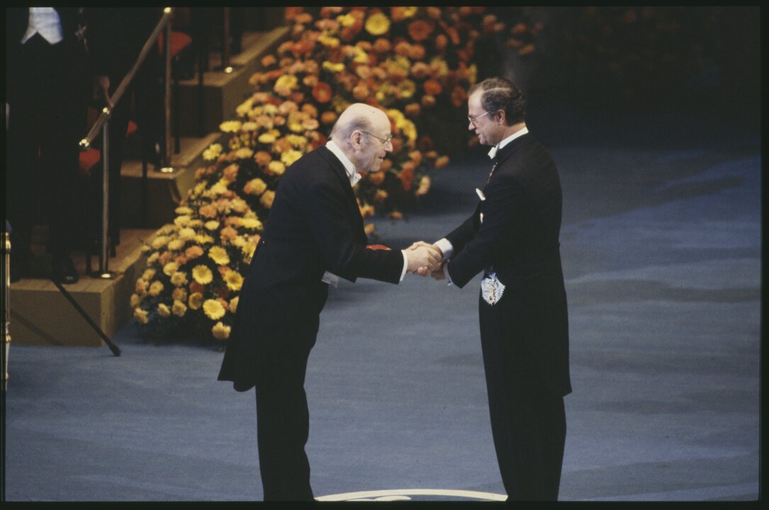 2 (of 5) Laureates assembled at the Nobel Prize award ceremony in the Stockholm Concert Hall on 10 December 1989: Physics laureates Norman F. Ramsey, Hans G. Dehmelt and Wolfgang Paul, chemistry laureates Sidney Altman and Thomas R. Cech, medicine laureates J. Michael Bishop and Harold E. Varmus, literature laureate Camilo José Cela and economic sciences laureate Trygve Haavelmo.