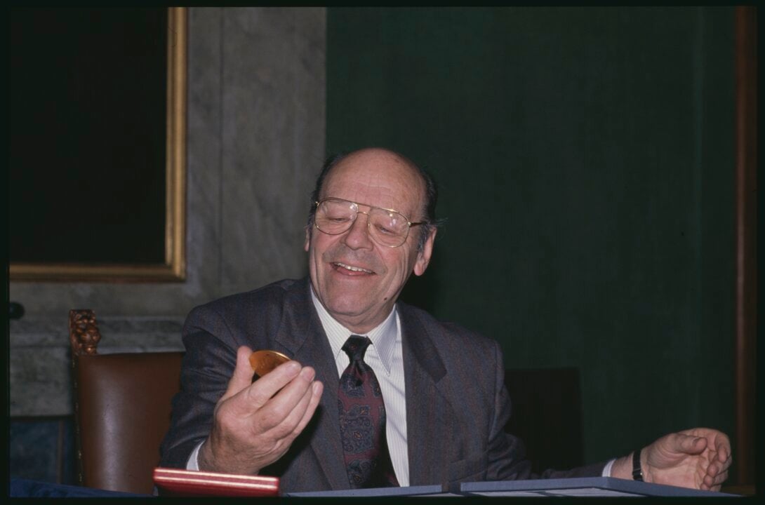 3 (of 5) Physics laureate Wolfgang Paul examining his Nobel Prize medal during his visit to the Nobel Foundation in December 1989.