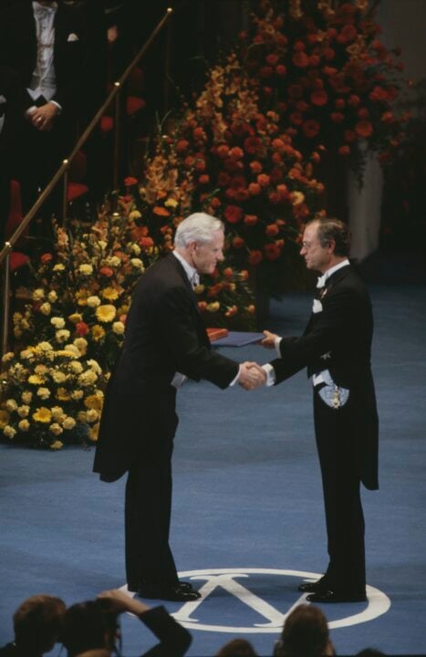 1 (of 3) Henry W. Kendall receiving his Nobel Prize from H.M. King Carl XVI Gustaf of Sweden at the Stockholm Concert Hall, on 10 December 1990.