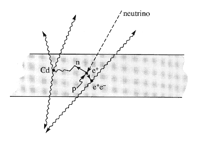 Strålmålet i Reines-Cowan-experimentet bestod av ca 400 liter vatten innehållande kadmiumklorid placerat mellan stora vätskescintillationsdetektorer. Händelseförloppet för den sökta reaktionen är följande (jfr formeln ovan): Neutrinon krockar med en proton i vattnet och skapar en positron och en neutron. Positronen bromsas ner av vattnet och förintas tillsammans med någon elektron (materia och antimateria möts) varvid två fotoner (ljuspartiklar) uppstår. Dessa registreras samtidigt i de två detektorerna (Fig. 3). Även neutronen tappar fart i vattnet och fångas så småningom in av en kadmiumkärna, varvid ett antal fotoner utsänds. Dessa fotoner når detektorerna någon mikrosekund senare än fotonerna från positronens förintelse och ger besked om att neutrinoinfångningen har ägt rum.