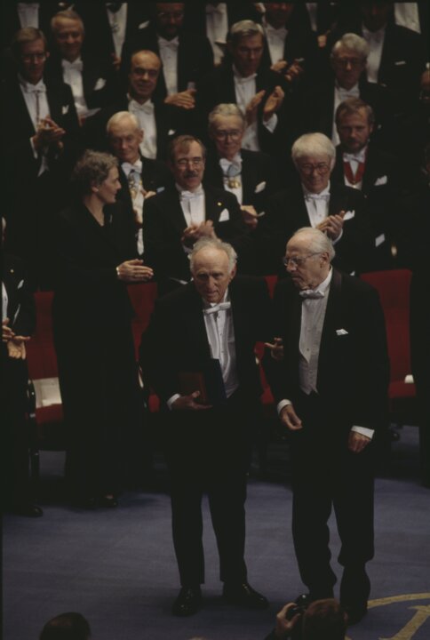 2 (of 11) Martin L. Perl and Frederick Reines after receiving their Nobel Prizes from H.M. King Carl XVI Gustaf of Sweden at Konserthuset Stockholm on 10 December 1995.
