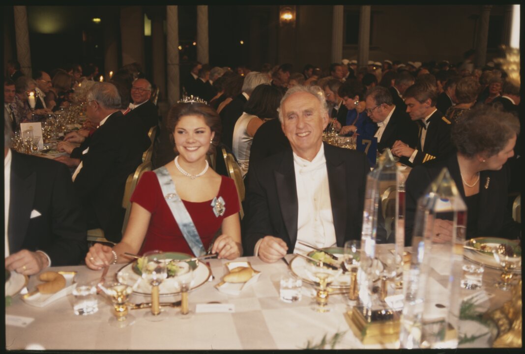 7 (of 11) From left: Sweden's Crown Princess Victoria, physics laureate Martin L. Perl, medicine laureate Christiane Nüsslein-Volhard and H.M. King Carl XVI Gustaf of Sweden at the Nobel Prize banquet in the Stockholm City Hall, 10 December 1995.