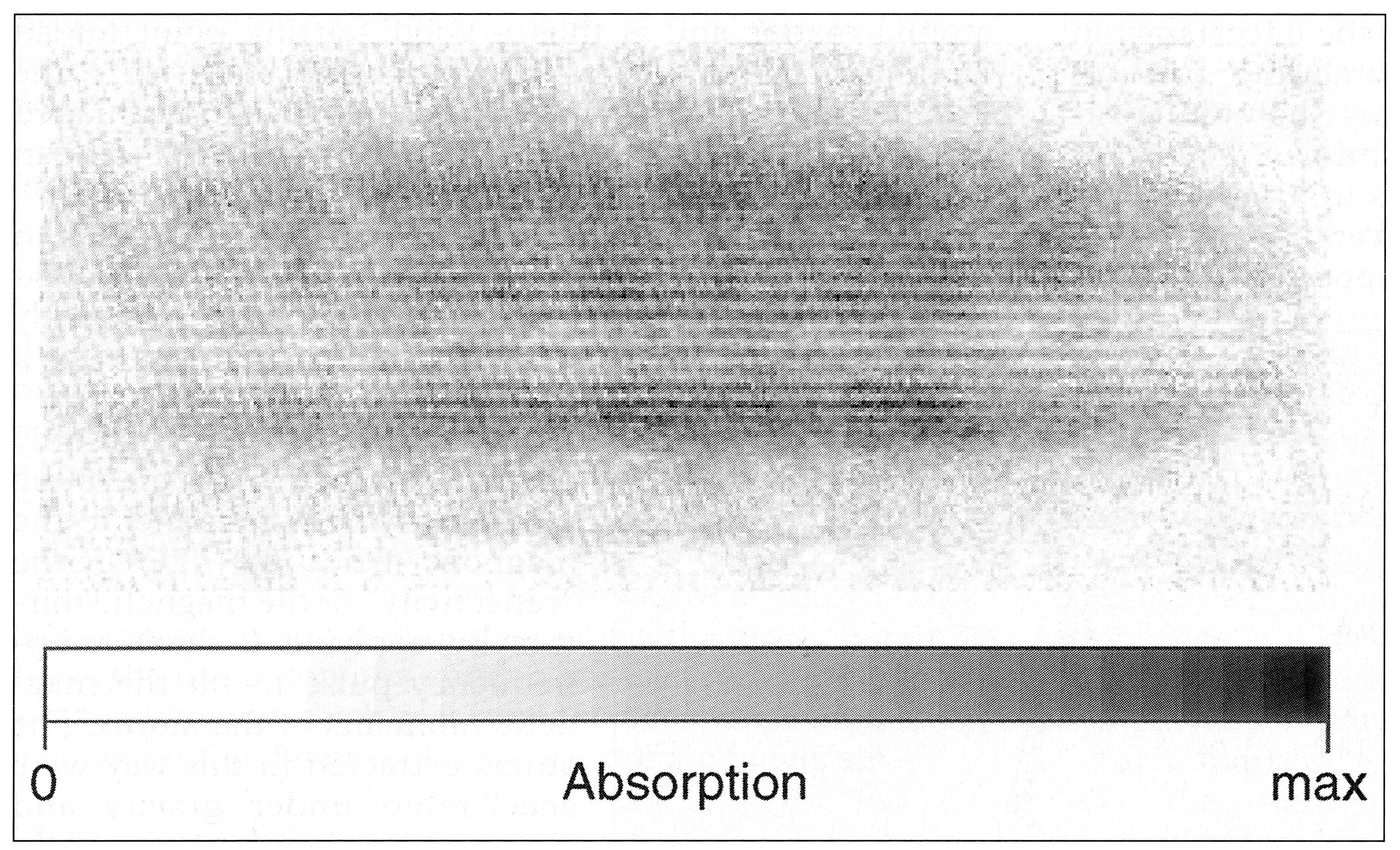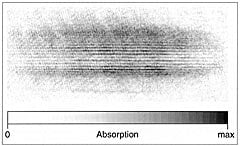 | Figure 2. Pattern of interference between two overlapping Bose-Einstein condensates of sodium atoms. The image was made in absorption. Matter-wave interferences have a periodicity of 15 micrometer. The recording shows that the atoms of the two condensates were fully co-ordinated. | |