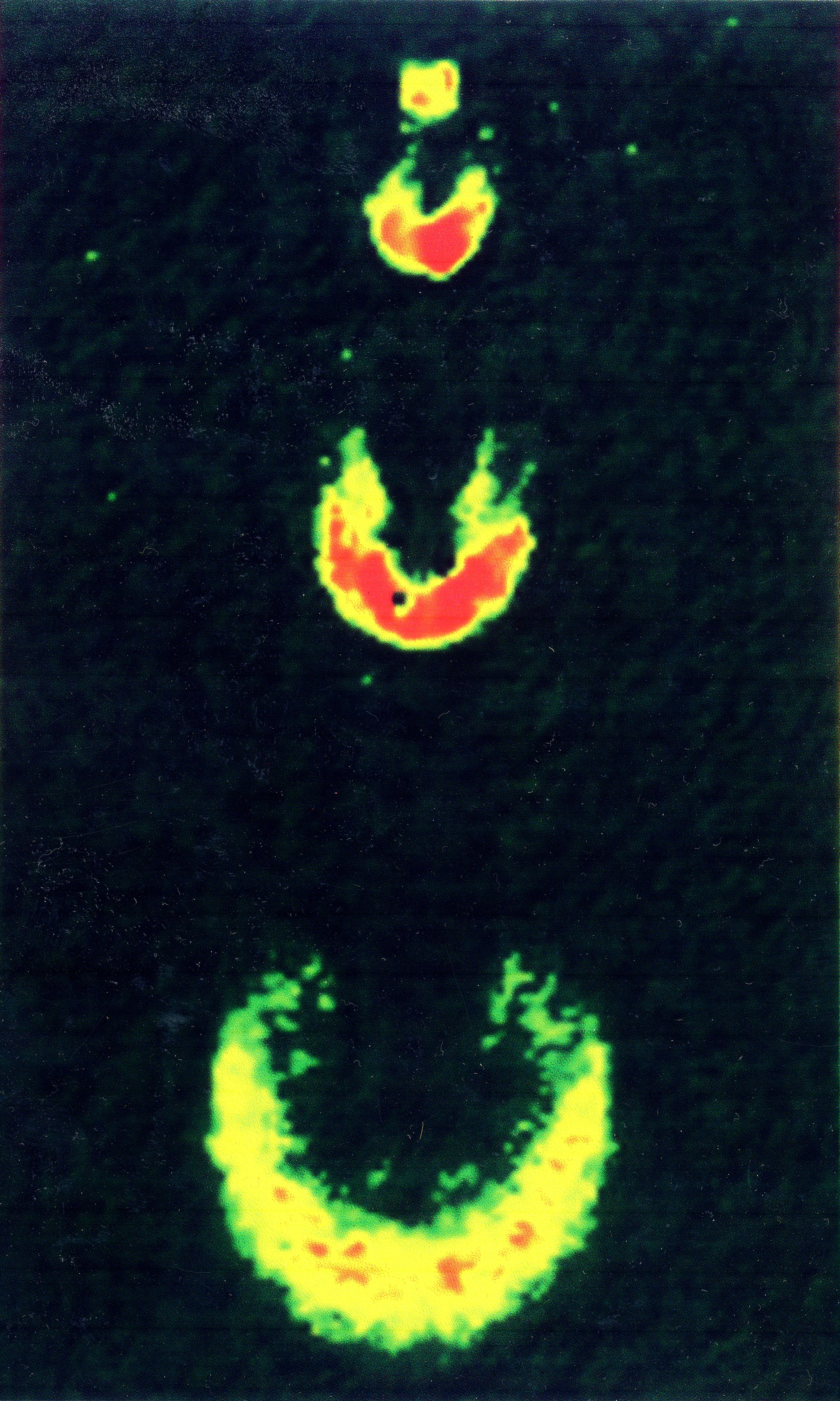Ketterle worked independently of the Colorado group using sodium atoms which absorb and emit yellow light. He came from Germany in 1990 as a postdoc to D. Pritchard’s group at MIT and assumed main responsibility for the BEC project in 1993. Ketterle solved the problem of atom losses at the centre of the trap by focusing there a powerful laser beam which kept the atoms away from the loss area. He published his BEC results for sodium only four months after the publication of the JILA group. Ketterle showed recordings similar to those shown in figure 1 but now with many more atoms in the condensate. Since there were now many hundred times more atoms to work with, it became possible to make spectacular measurements of the properties of the condensate. It was shown for example that two separate condensates, if allowed to expand into each other, exhibit very clear interference effects (figure 2), indicating the coherence of matter waves and long-range correlation. Ketterle also demonstrated how parts of the condensate could be successively switched out in ‘BEC drops’ that fall in the field of gravity (figure 3). The phenomenon has been described as an atom laser of coherent matter.