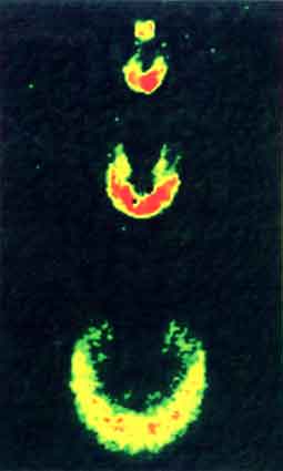 | Figure 3. Repeated release from the trap of parts of a Bose-Einstein condensate of sodium atoms. Pulses of coherent matter fall in the gravitational field – the phenomenon can be seen as an atom laser effect. The real size of the picture is 2.5 mm X 5 mm. | |