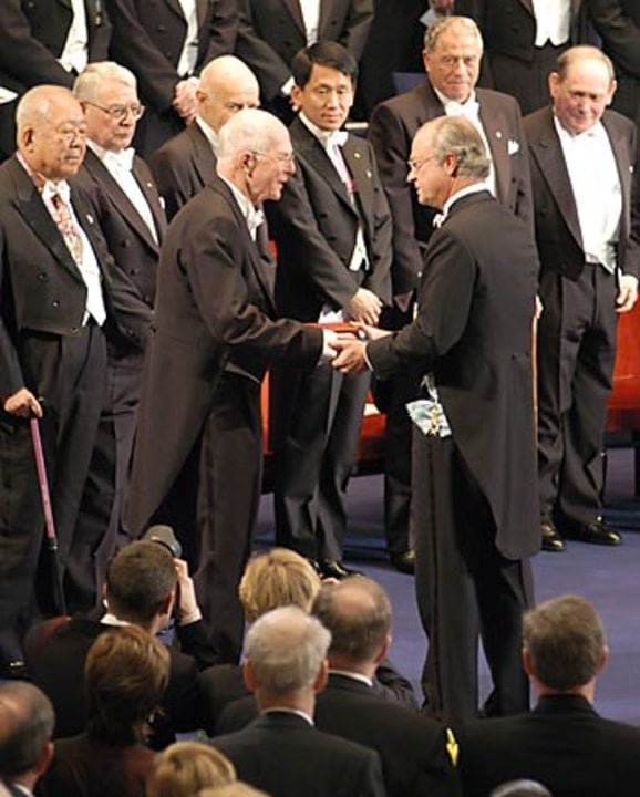 Raymond Davis Jr. receiving his Nobel Prize from His Majesty King Carl XVI Gustaf of Sweden at the Stockholm Concert Hall, 10 December 2002.