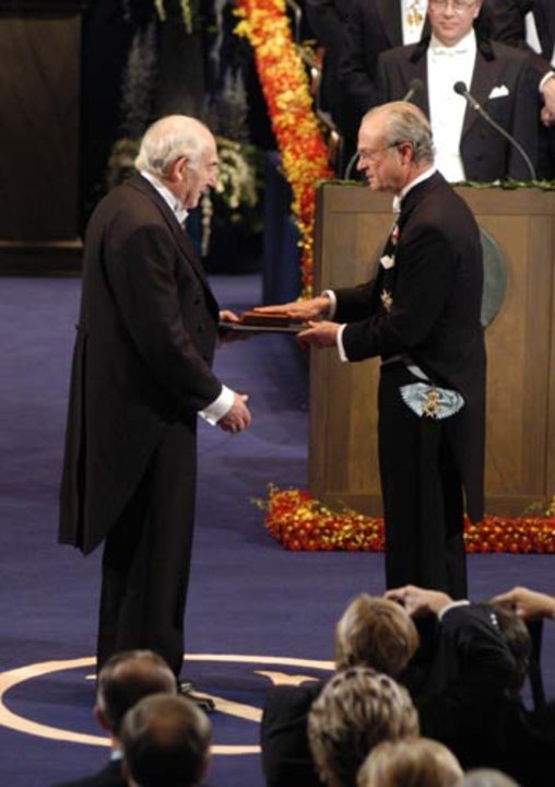 Vitaly L. Ginzburg receiving his Nobel Prize from His Majesty King Carl XVI Gustaf of Sweden at the Stockholm Concert Hall, 10 December 2003.