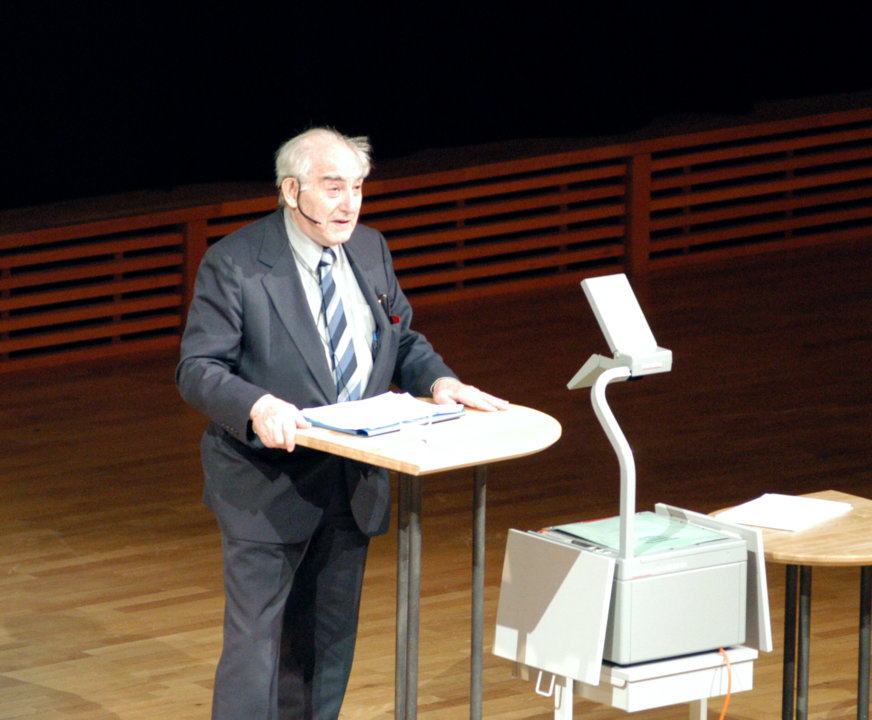 Vitaly L. Ginzburg delivering his Nobel Lecture at the Aula Magna, Stockholm University, 8 December 2003.