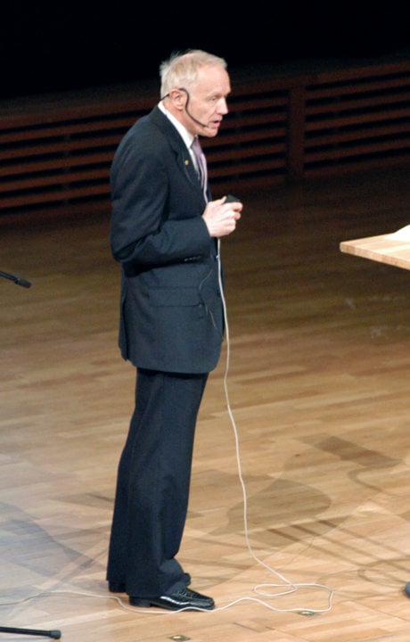 Anthony J. Leggett delivering his Nobel Lecture at the Aula Magna, Stockholm University, 8 December 2003.
