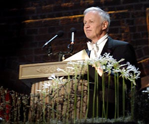 Anthony J. Leggett receiving receiving his Nobel Prize from His Majesty King Carl XVI Gustaf of Sweden at the Stockholm Concert Hall, 10 December 2003.