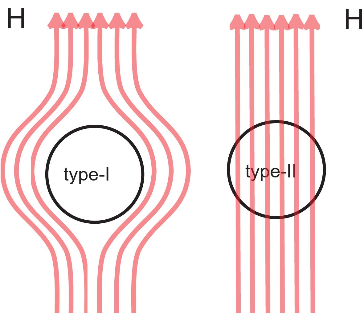 Fig. 1. Type-I superconductors repel a magnetic field (the Meissner effect). If the strength of the magnetic field increases, they lose their superconductivity. This does not happen with type-II superconductors, which accommodate strong magnetic fields by letting the magnetic field in.