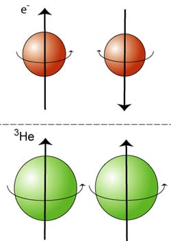 | Fig. 4. The pair formation that occurs in superfluid 3He differs from that which occurs between electrons in a superconductor (Cooper pairs). The magnetic properties of the helium atoms act together, whereas those of the electrons counteract each other. |