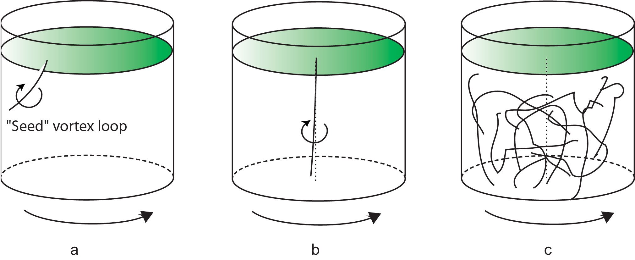 | Fig. 6. It has recently been shown that if a vortex is created in a rotating vessel containing superfluid 3He (a), the result can critically depend on the temperature. Above a critical temperature the vortex lines up along the axis of rotation (b). Below the critical temperature a confusion of vortices occurs (c). |
