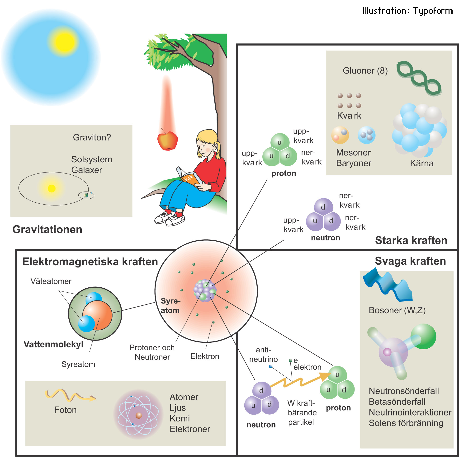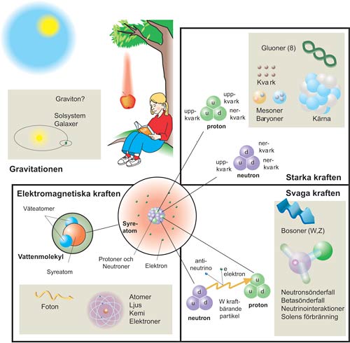 Fig. 1. Naturens fyra krafter eller växelverkningar, deras kraftbärare och de företeelser eller partiklar som påverkas av dem. De tre växelverkningar som styr i mikrokosmos är alla mycket kraftigare än gravitationen och har förenats genom standardmodellen.