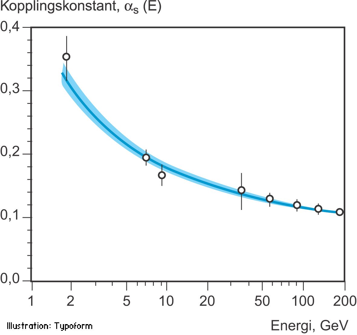 Fig. 2. Värdet på den “löpande” kopplingskonstanten, as , som funktion av energiskalan E. Kurvan som sluttar nedåt (negativ betafunktion) är förutsägelsen från den asymptotiska friheten i QCD och stämmer som synes mycket bra överens med de mätningar som gjorts.