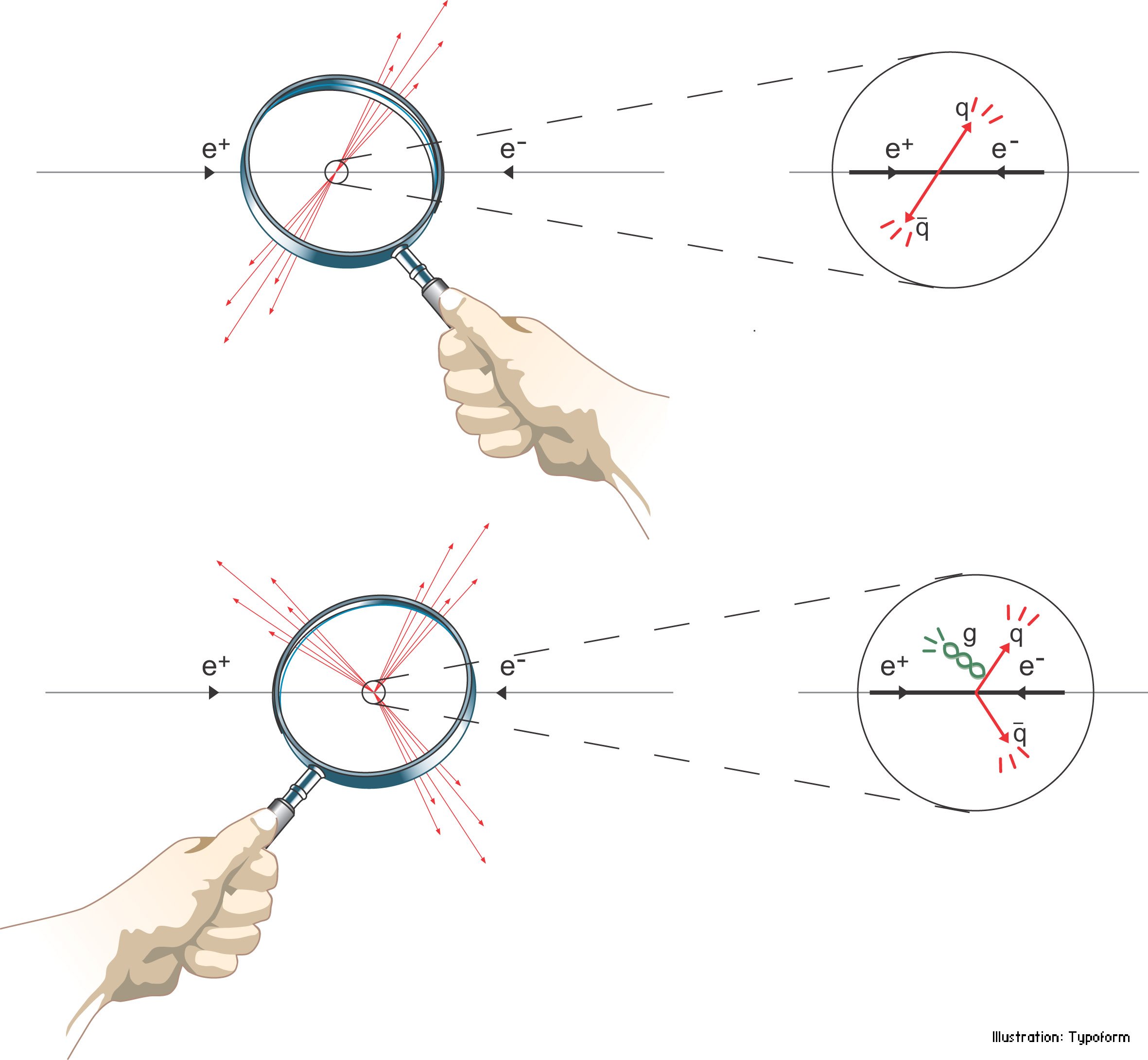 Fig. 3. Händelser med två eller tre skurar av partiklar som observerats vid kollisioner mellan elektroner och positroner. I förstoringen syns tolkningen i den asymptotiskt fria teorin QCD, som också tillåter noggranna beräkningar av sannolikheten för respektive händelse. De sannolikheterna stämmer mycket bra med uppmätta data (e= elektron, e+= positron, q= kvark, q med överstreck= antikvark, g= gluon).