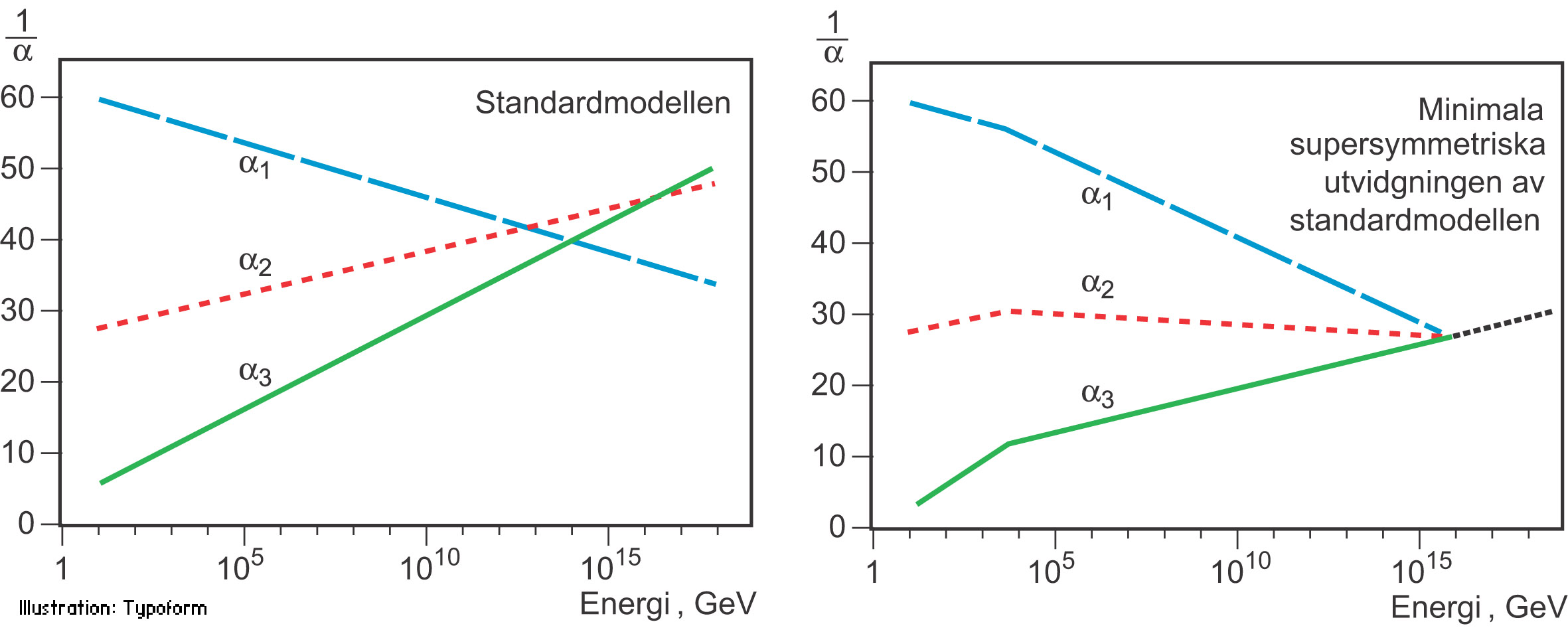 Fig. 4. Löpande kopplingskonstanter i standardmodellen (t.v.) och med supersymmetri (t.h.). De tre kurvorna, som visar det inverterade värdet av kopplingskonstanten för de tre fundamentala krafterna skär inte varandra i samma punkt i standardmodellen, men gör det i den supersymmetriska utvidgningen, om de supersymmetriska partiklarna inte är mycket tyngre än ungefär 1 TeV/c2. Är detta en föraning om att supersymmetri kommer att hittas vid nästa accelerator, LHC vid CERN, eller är det bara en slump?