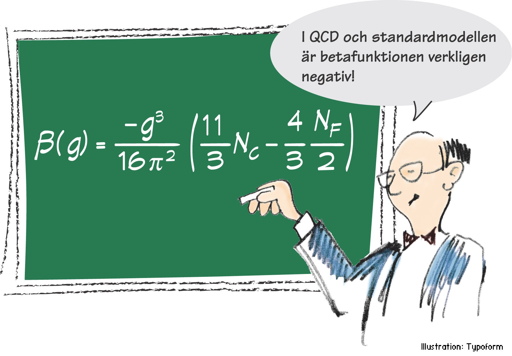 Ännu värre verkade det bli vid högre energier. Om betafunktionen – som beskriver hur kopplingskonstanten förändras med energin – är positiv blir ju växelverkan allt starkare och beräkningarna mer och mer absurda.