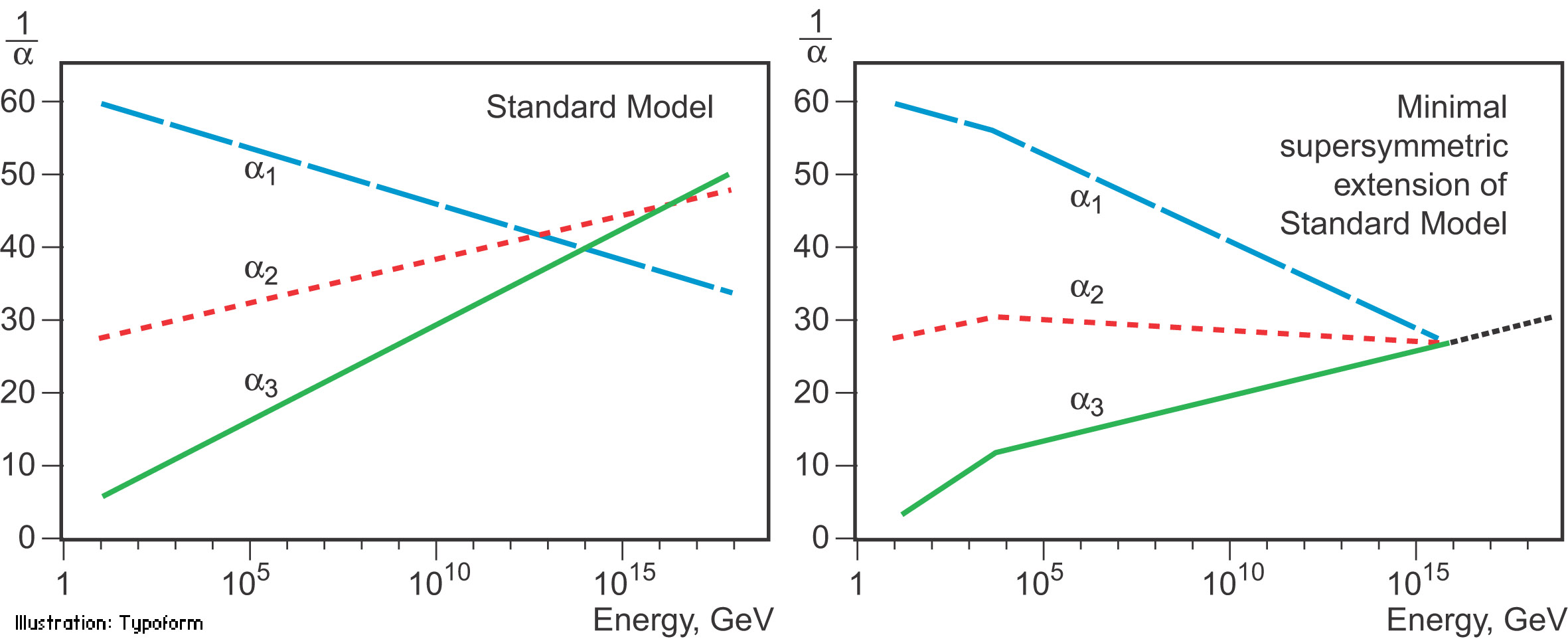 | Fig. 4. Running coupling constants in the Standard Model (left) and with the introduction of supersymmetry (right). In the Standard Model the three lines, which show the inverse value of the coupling constant for the three fundamental forces, do not meet at one point, but with the introduction of supersymmetry, and assuming that the supersymmetric particles are not heavier than about 1 TeV/c2, they do meet at one point. Is this an indication that supersymmetry will be discovered at the next accelerator at CERN, the Large Hadron Collider, or is it merely a coincidence? |