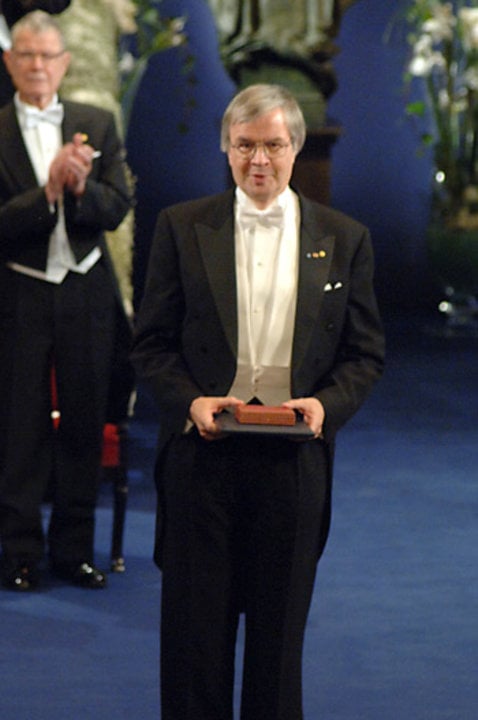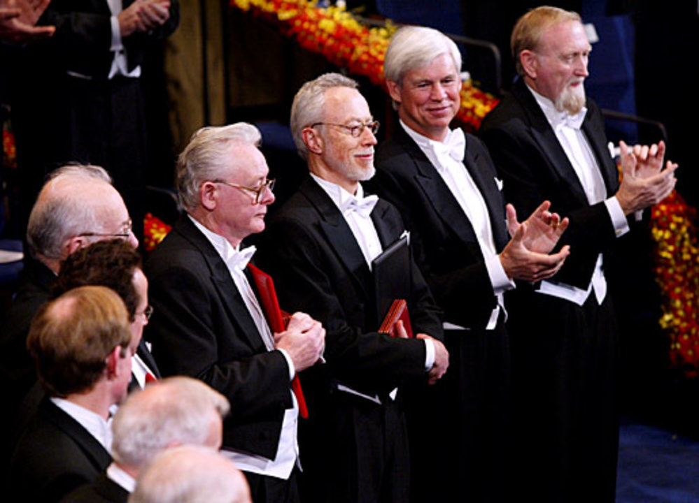 All the 2005 Nobel Laureates assembled for a group photo during their visit to the Nobel Foundation in December, 2005. Left to right: John L. Hall, Robert J. Aumann,