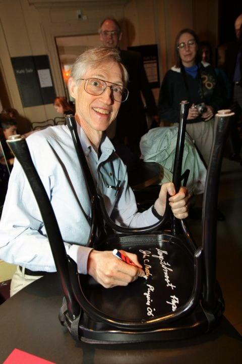 13 (of 18) John C. Mather, like many Nobel Laureates before him, autographs a chair at Kafé Satir at the Nobel Museum in Stockholm, 6 December 2006.
