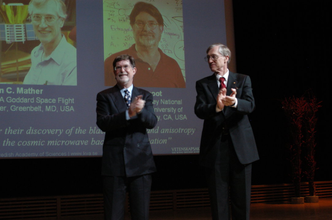 From left: Per Carlson, George F. Smoot and John C. Mather at the Aula Magna, Stockholm University, 8 December 2006.