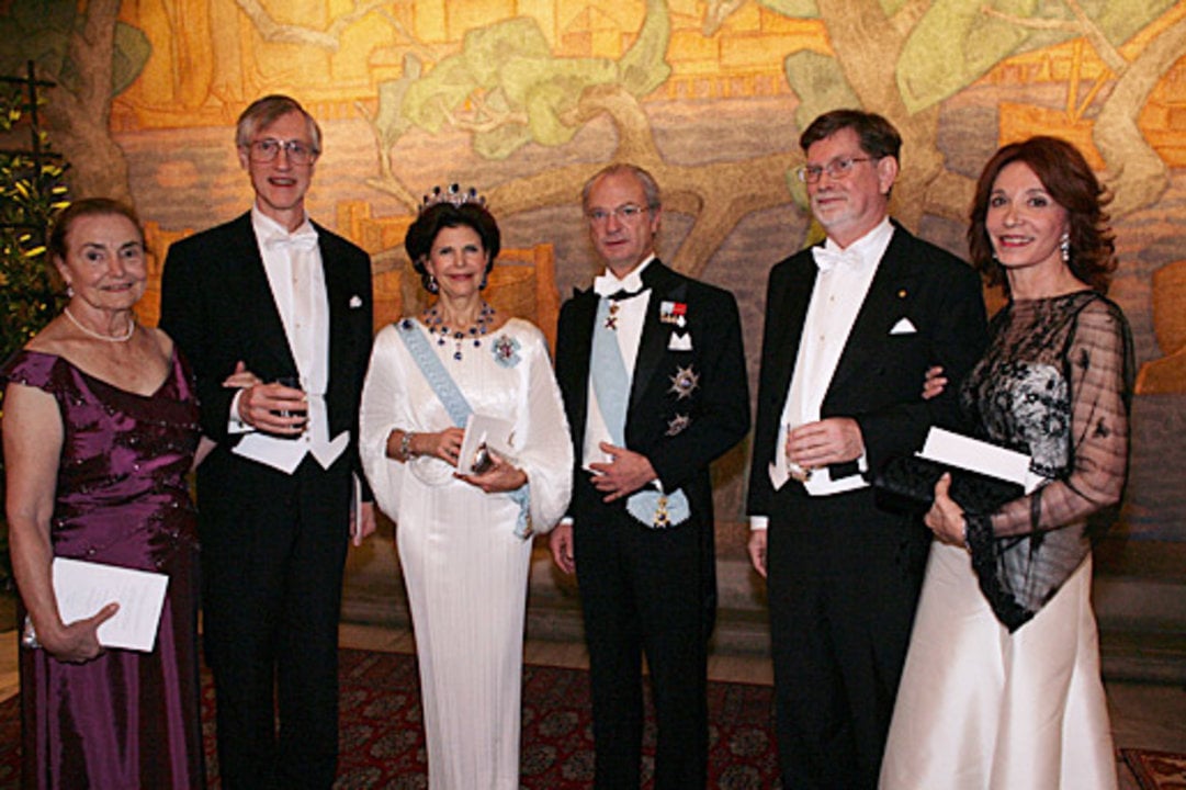 Their Majesties Queen Silvia and King Carl XVI Gustaf of Sweden (middle) posing with John C. Mather and his wife, Jane Mather (left), and George F. Smoot and Christina Skube (right) at the Nobel Banquet, 10 December 2006.