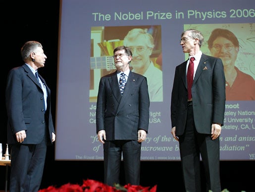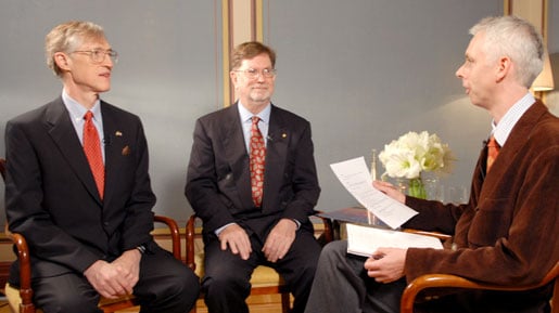John C. Mather (left) and George F. Smoot (middle) at the interview in Stockholm, 6 December 2006. The interviewer is Adam Smith, Editor-in-Chief of Nobelprize.org.