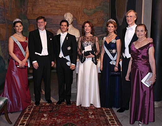 The Nobel Laureates in Physics and the Royal Swedish siblings. Left to right: Crown Princess Victoria, George F. Smoot, Prince Carl Philip, Christina Skube, Princess Madeleine, John C. Mather, and Jane Mather.