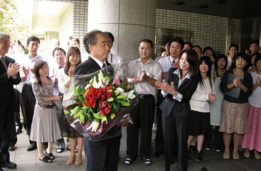 9 (of 14) Makoto Kobayashi is greeted with flowers by colleagues at KEK.