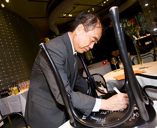 7 (of 14) Makoto Kobayashi, like many Nobel Laureates before him, autographs a chair at Kafé Satir at the Nobel Museum in Stockholm, 6 December 2008.