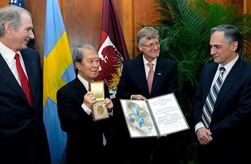 4 (of 15) Yoichiro Nambu (right) receiving his Nobel Prize from Swedish Ambassador Jonas Hafström (left) at a ceremony at The International House in Chicago, 10 December 2008.