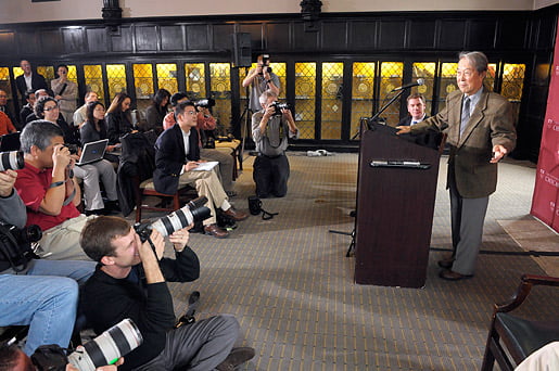 14 (of 15) Yoichiro Nambu speaks to the media on the morning he was awarded the 2008 Nobel Prize in Physics.