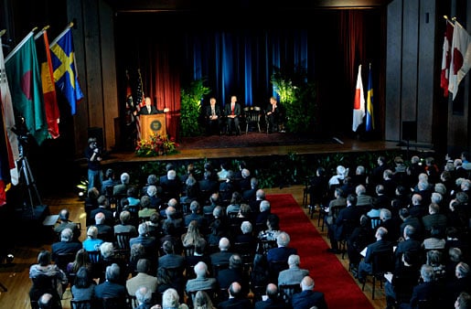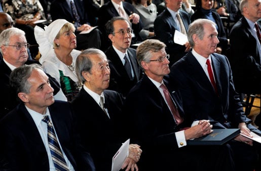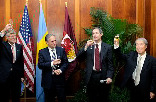 7 (of 15) A toast for the new Nobel Laureate. From left: Swedish Ambassador Jonas Hafström, University of Chicago President Robert J. Zimmer, University of Chicago Provost Thomas Rosenbaum and Nobel Laureate Yoichiro Nambu.