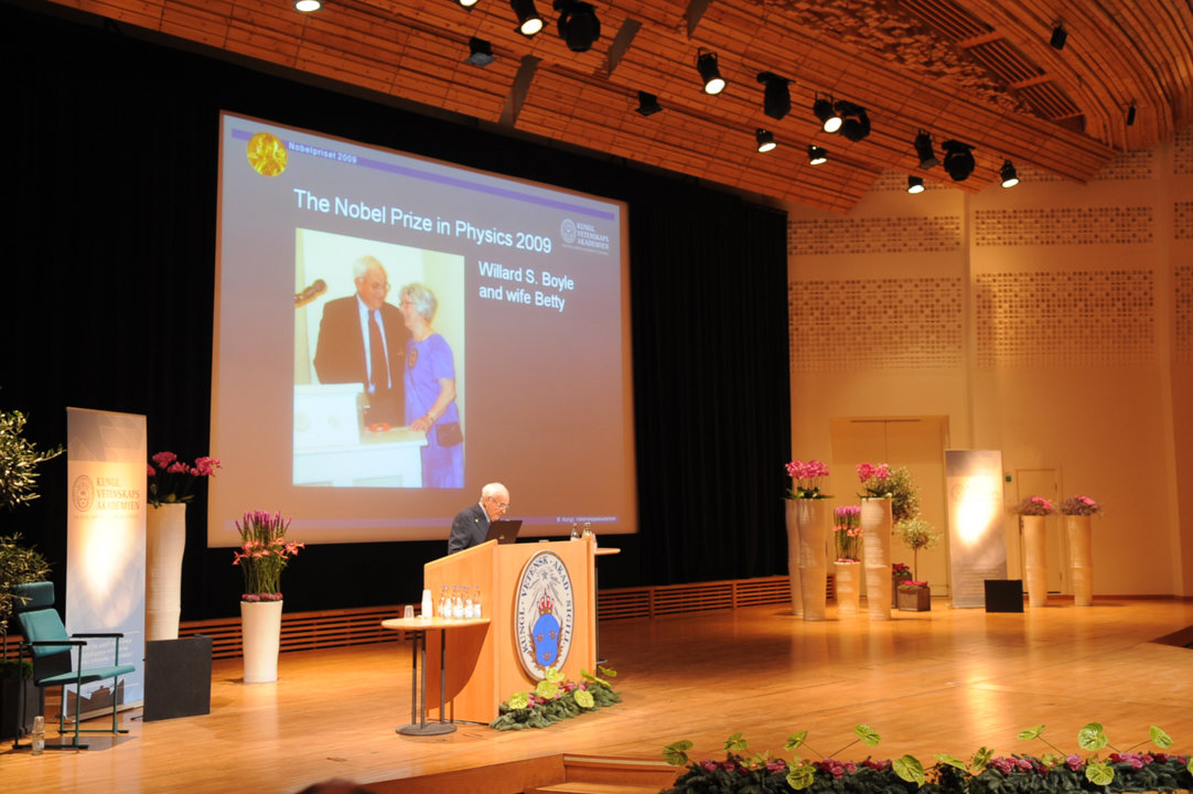 Willard S. Boyle delivering his Nobel Lecture at the Aula Magna, Stockholm University, 8 December 2009.