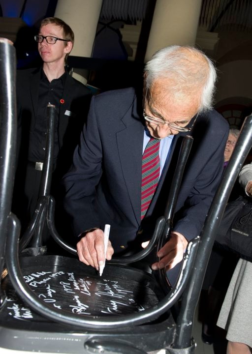 12 (of 14) Willard S. Boyle, like many Nobel Laureates before him, autographs a chair at Kafé Satir at the Nobel Museum in Stockholm, 6 December 2009.