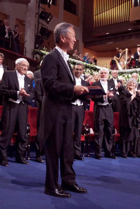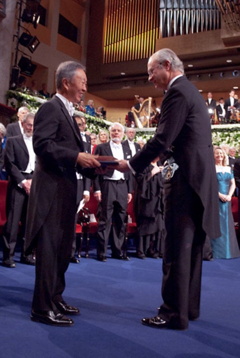Charles K. Kao receiving his Nobel Prize from His Majesty King Carl XVI Gustaf of Sweden at the Stockholm Concert Hall, 10 December 2009.