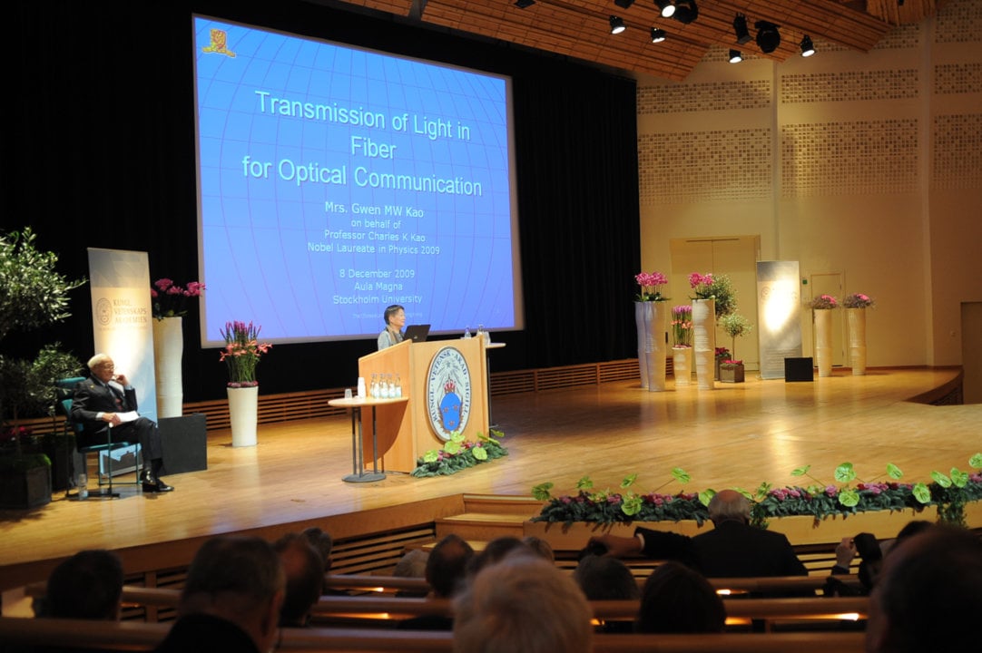 Charles K. Kao's Nobel Lecture was held by his wife, Mrs May W. Kao, at Aula Magna in Stockholm University on 8 December 2009.