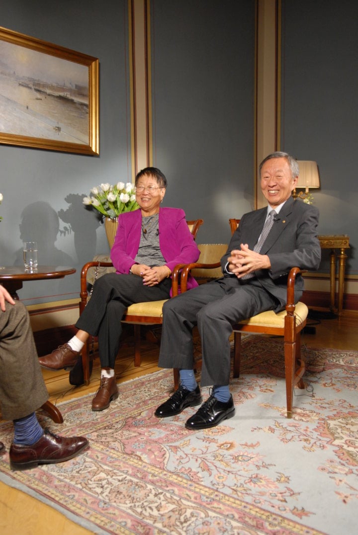 Mrs May W. Kao and Charles K. Kao during the interview with Nobelprize.org in Stockholm, 6 December 2009. The interviewer is Adam Smith, Editor-in-Chief of Nobelprize.org.