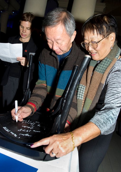 16 (of 19) Like many Nobel Laureates before him, Charles K. Kao assisted by his wife Mrs May W. Kao, autographs a chair at Kafé Satir at the Nobel Museum in Stockholm, 6 December 2009.