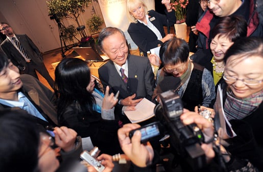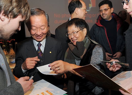 Charles K. Kao, assisted by his wife, Mrs May W. Kao, signing autographs for enthusiastic students after the Nobel Lecture in Stockholm, 8 December 2009.