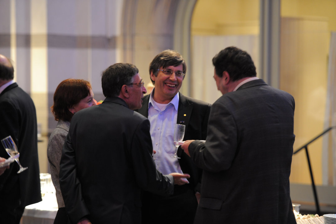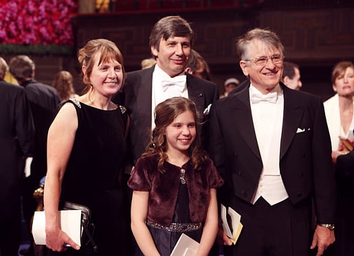 Andre Geim (second from left) with his wife Dr Irina Grigorieva (far left), daughter Alexandra Geim (middle) and 1985 Nobel Laureate in Physics Klaus von Klitzing (right) after the Nobel Prize Award Ceremony in Stockholm, 10 December 2010.