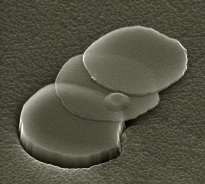20 (of 20) Scanning electron micrograph (SEM) of a fallen mesa of graphite. This is the way graphene molecules were "extracted" from bulk graphite. To be reasonably visible in SEM, we show a 10 nm carbon flake (30 layer thick).