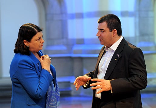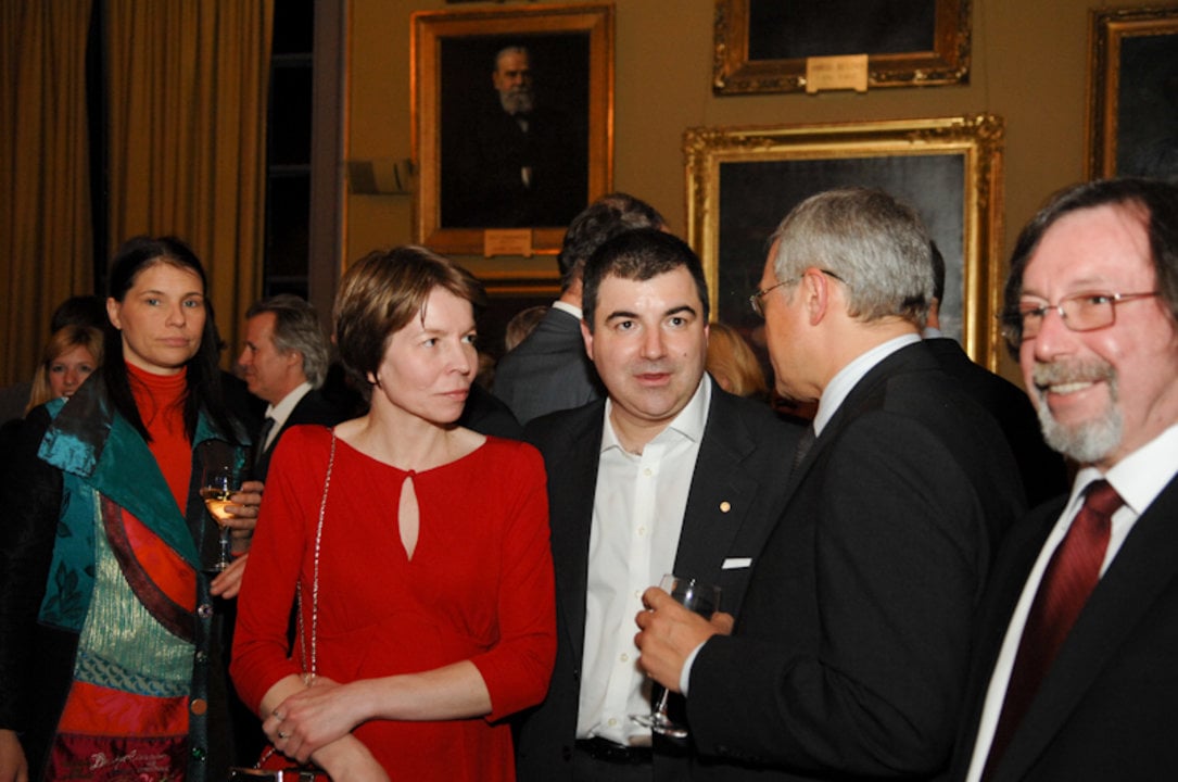 Konstantin Novoselov talking to Máire Geoghegan-Quinn, European Commissioner for Research, during the Nobel Foundation reception at the Nordic Museum in Stockholm, 9 December 2010.